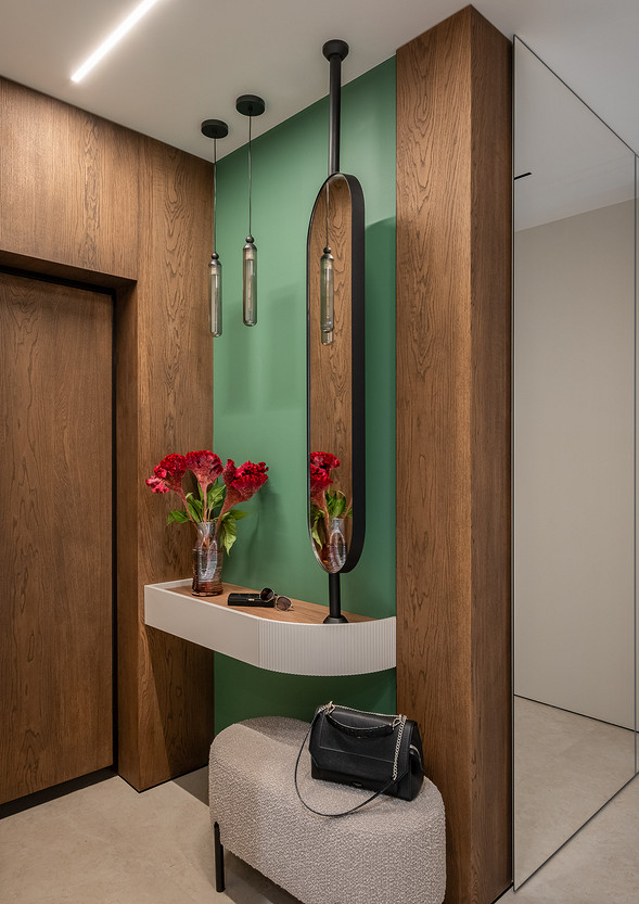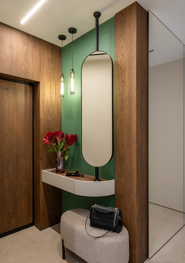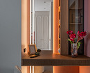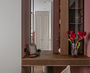 Планируя системы хранения в квартире для двух представительниц прекрасного пола, сделали ставку и на эстетику, и на функциональность. Сразу при входе разместилась полукруглая консоль с бортиками на столешнице (удобно, так как нельзя случайно что-то смахнуть), а также зеркало на штанге, которое поворачивается вокруг своей оси.