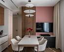 В зоне гостиной — диван, а напротив — тумба под телевизор. Обеденный стол предусмотрен на четыре персоны.