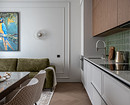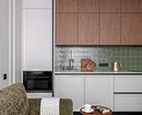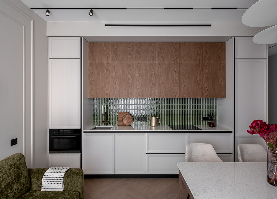 В кухне-гостиной удалось разместить все необходимое. Кухня выстроена в линию, есть вся техника для комфортного быта, а также места для хранения.