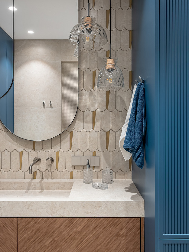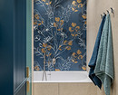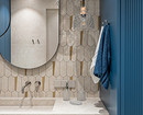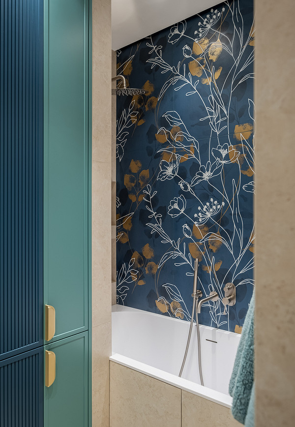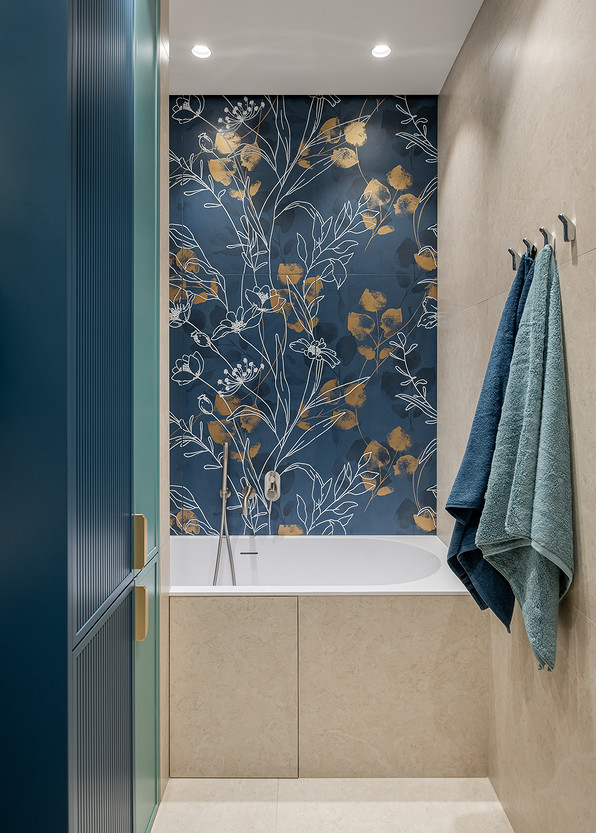 Для пола выбрали инженерную доску и уложили ее «елочкой». В прихожей и коридоре использовали светлый керамогранит. Такой же уложили на пол в ванной комнате. А отделка стен ванной разнообразна. В помещении две акцентные стены: над ванной уложена плитка с цветочным рисунком, а в зоне раковины — плитка светлого оттенка с золотыми вкраплениями.