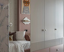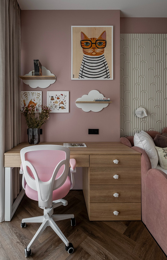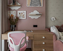 В детской продуманы места для хранения одежды (шкаф), учебы (рабочий стол с выдвижными ящиками), а также туалетный столик с зеркалом.