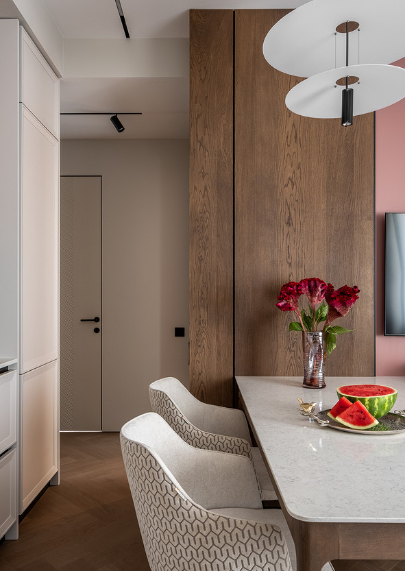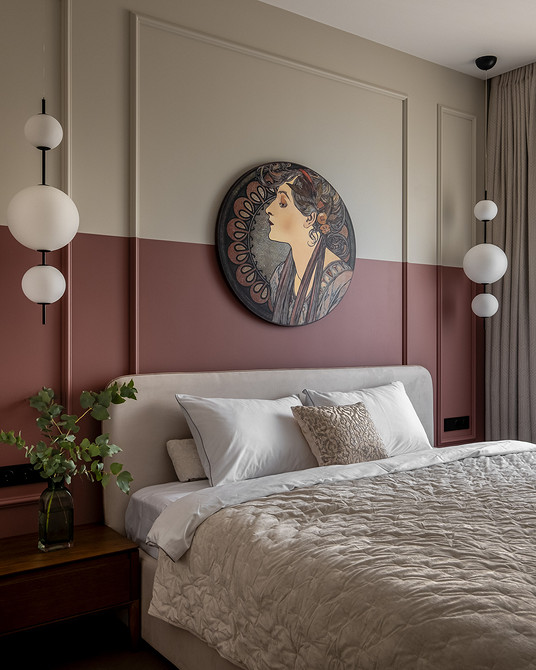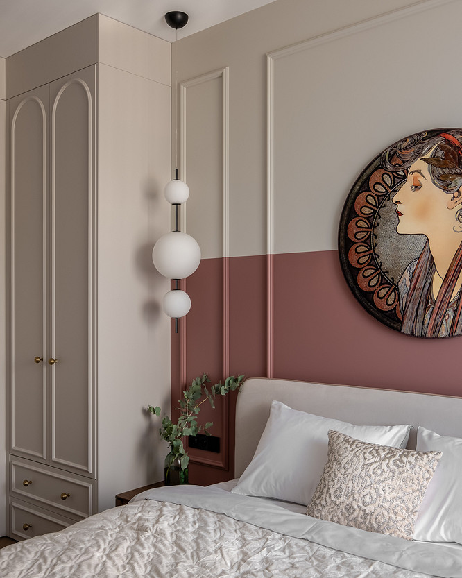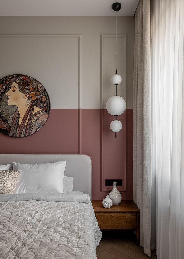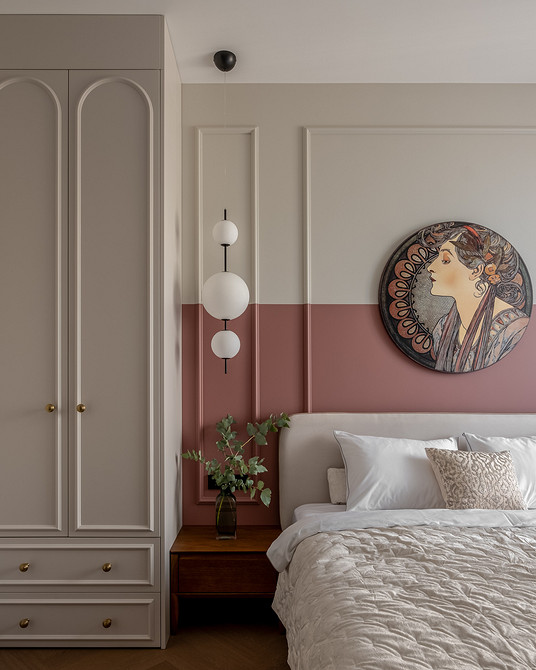 Именно поэтому в качестве основы выбрали именно окрашивание стен. Зеленый оттенок в коридоре, пыльный розовый в гостиной, чуть более насыщенный оттенок розового использовали в хозяйской спальне, а более нежный — в комнате девочки. Конечно, все это сочетается с базой — светлым оттенком стен.