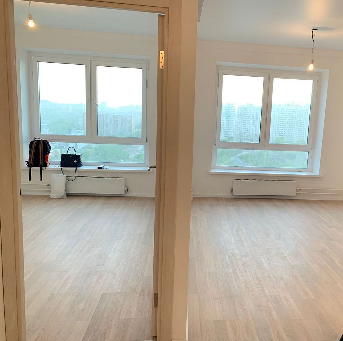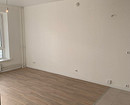 Застройщик оклеил стены белыми обоями под покраску, на полу уложил ламинат в жилых зонах, а в мокрых — плитку. Потолки были натяжными.