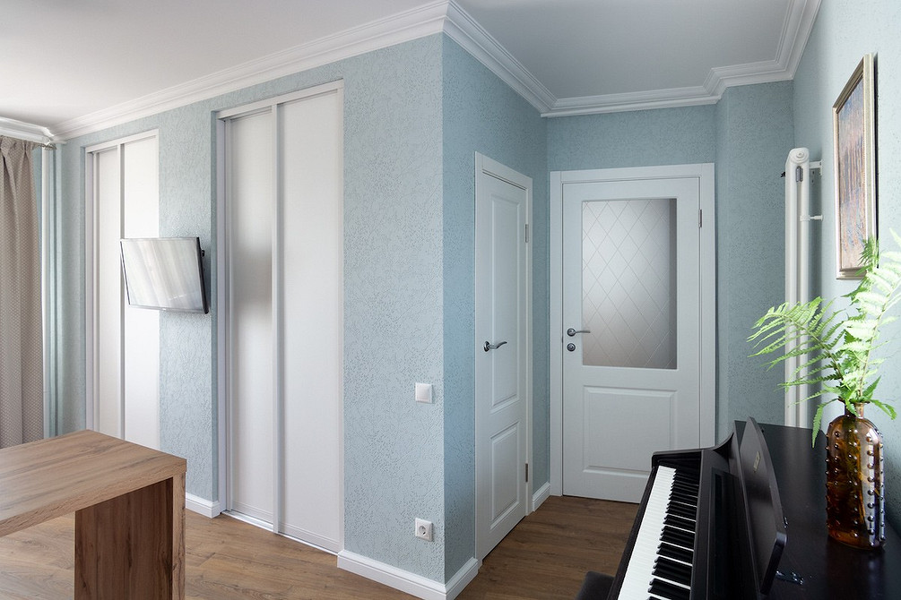 Между входной зоной и комнатами был длинный, темный и нефункциональный коридор. Эту проблему тоже решили с помощью перепланировки. Убрали перегородки между коридором и гостиной, таким образом расширив комнату и сократив проходное пространство.
