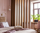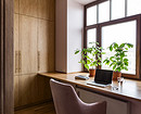 В спальне предусмотрели место для большой библиотеки владелицы квартиры. На фото, конечно, не выставлена вся коллекция книг, но вместительный стеллаж во всю стену сможет ее вместить. Напротив кровати предусмотрен комод для белья, а рядом с окном — столешница, которая делится на рабочее место и туалетный столик, и шкаф для вещей, документов.