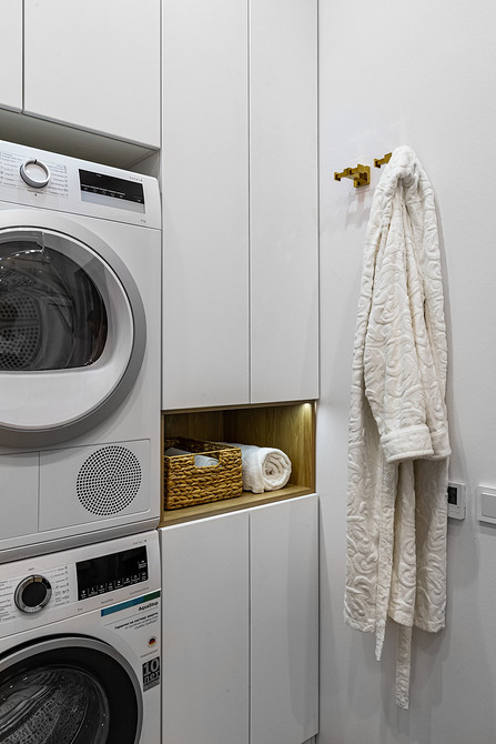 В ванной комнате продумали вместительный шкаф, куда встроили колонну из стиральной и сушильной машины. И это кроме тумбочки под раковину и шкафчика над инсталляцией унитаза.
