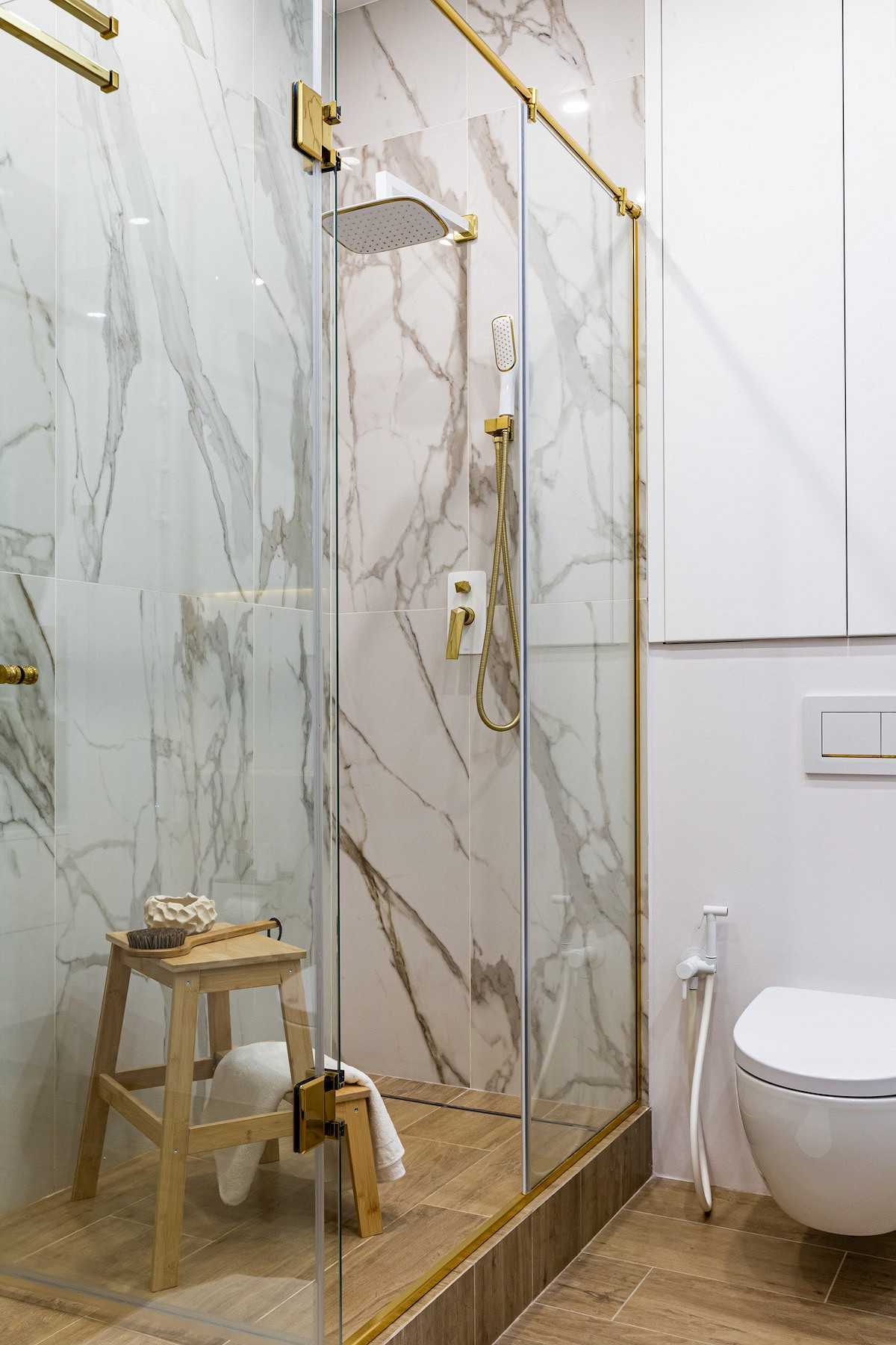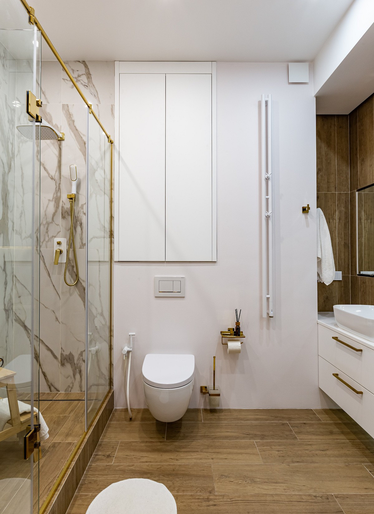 Говоря об отделке ванной — для стен использовали плитку под светлый мрамор, в зоне раковины стену выложили керамогранитом под дерево — тем же, что и на полу. Также керамогранит под мрамор можно заметить на фартуке кухни. Его прожилки отлично гармонируют с золотой фурнитурой кухонного гарнитура.