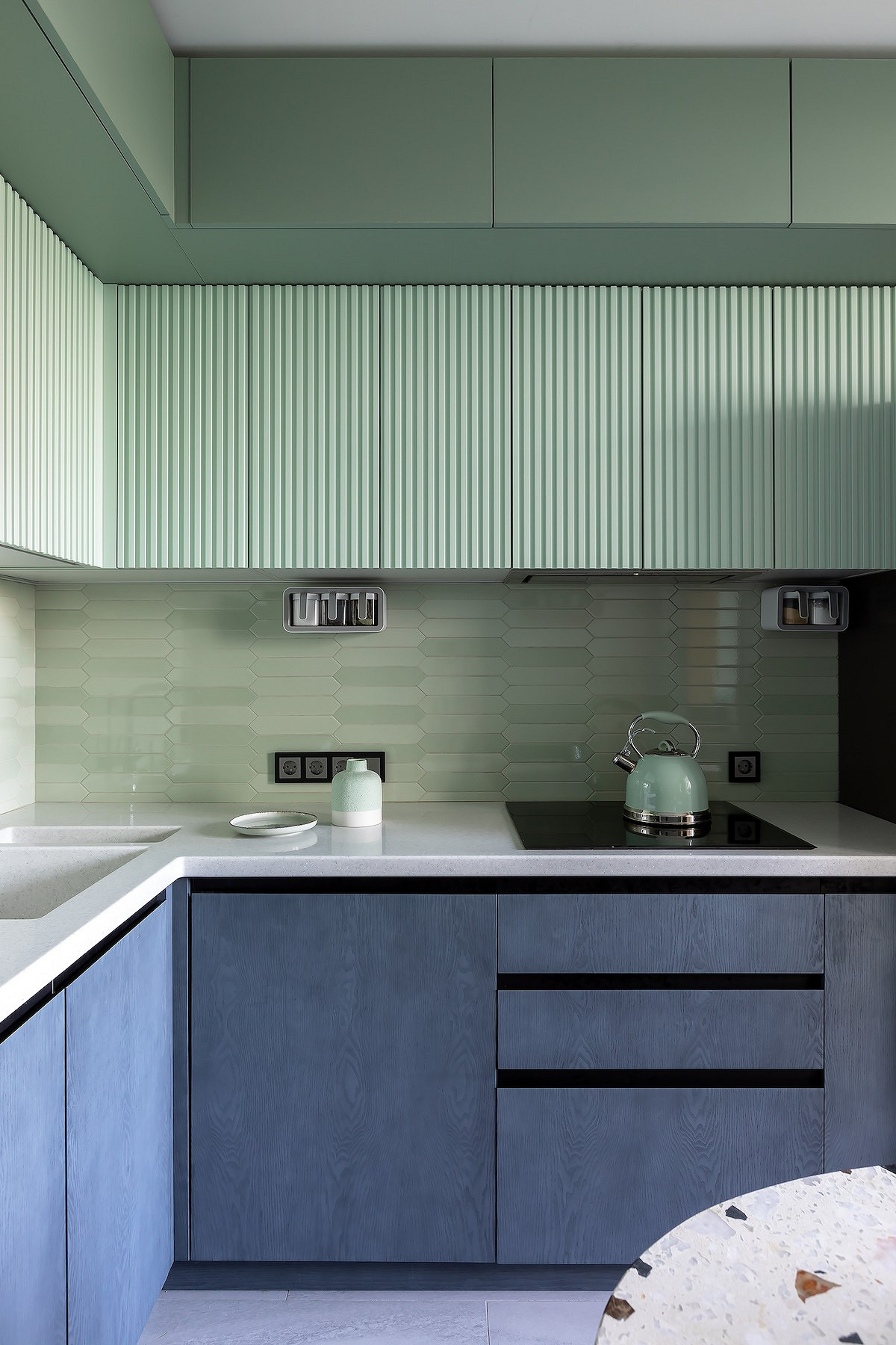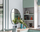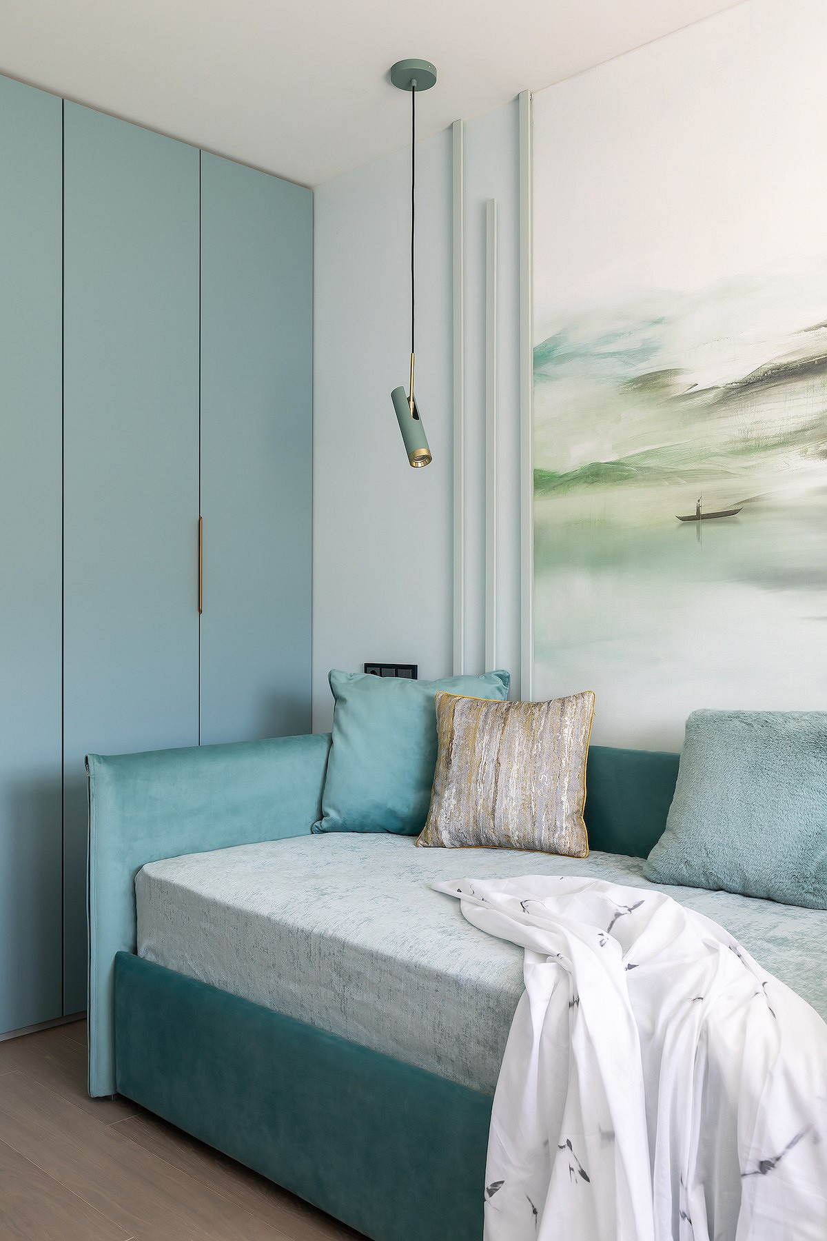 Кухня выполнена в мятных оттенках с акцентом на оконный проем на лоджию — его выделили цветом манго. В мятном цвете также оформлена комната старшей дочери. Она выходит на солнечную сторону, поэтому немного «охладить» помещение стало хорошей идеей.