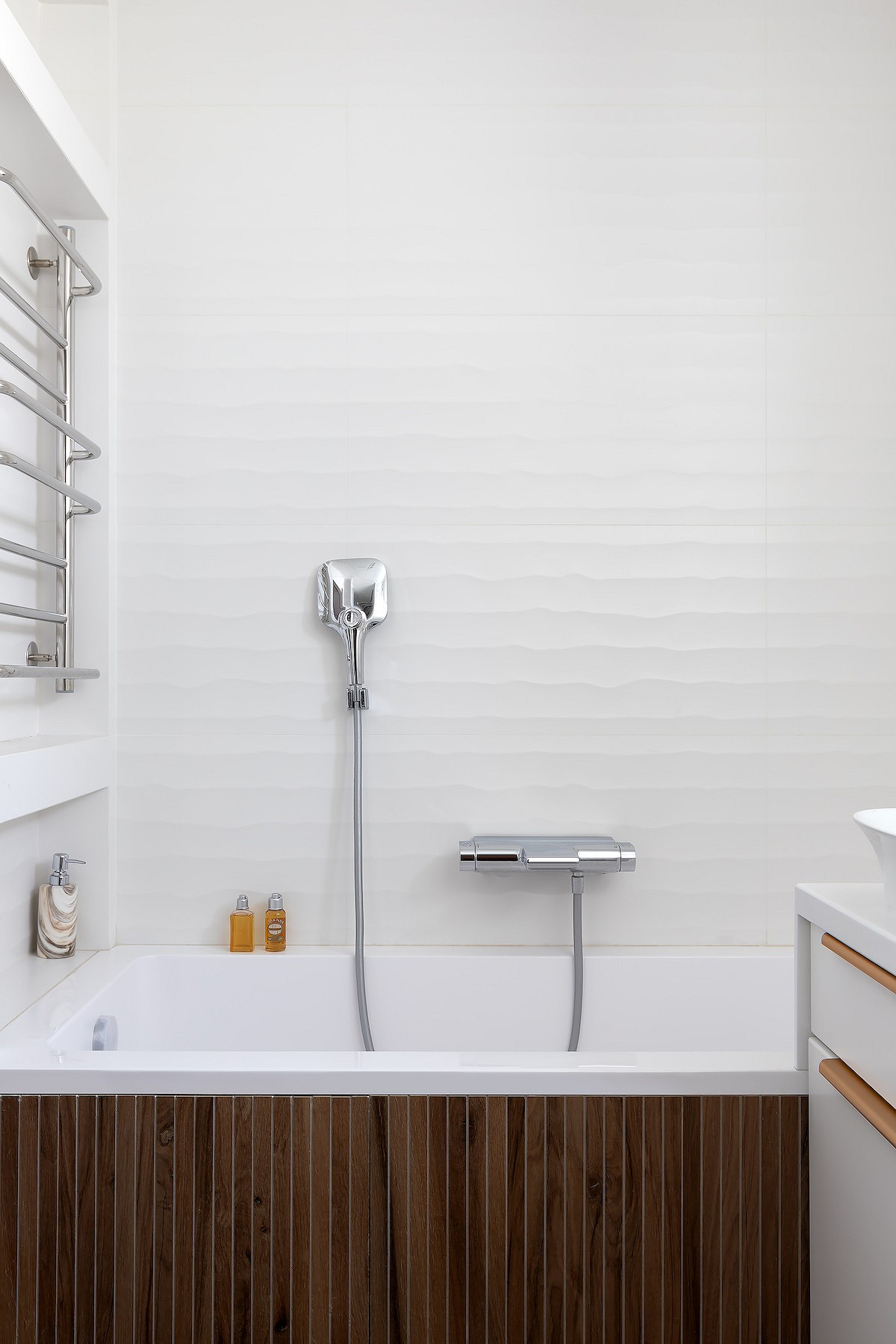 Ванную комнату оформили тремя видами белой плитки — фоновой гладкой, рельефной в зоне ванны и с золотыми вставками над раковиной, а душевую и пол — плиткой под дерево.