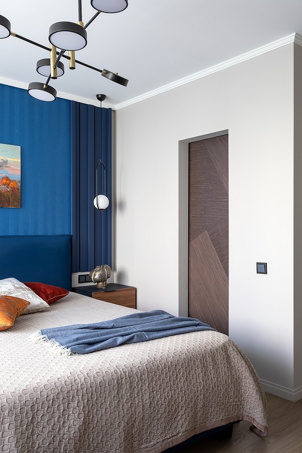В коридоре по одной стене использовали синее покрытие с металлическим блеском. Королевский синий применен в качестве акцента в спальне хозяев — это покрытие на обоях в изголовье кровати. Молдинги по бокам от изголовья окрашены в более глубокий синий оттенок.