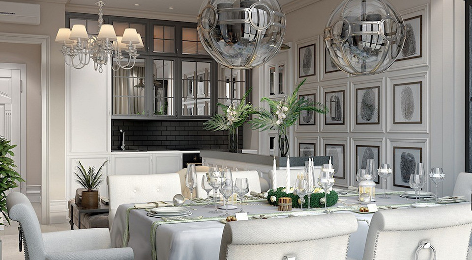 Торжественный вид обеденной зоне придадут подвесы в виде стеклянных шаров и симметрично расположенные шкафы, обрамлённые молдингами