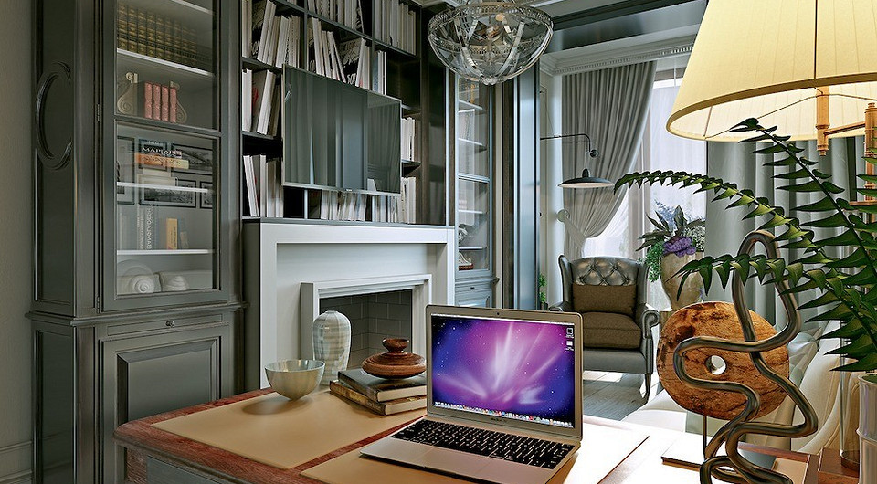 Благодаря камину кажется, что комната расположена в уютном загородном доме, а не в квартире в мегаполисе. Стены и встроенная мебель окрасят в строгие серые тона, вступающие в диалог с натуральными оттенками (кожи и дерева) отдельно стоящих предметов. Состаренное зеркальное панно, размещённое за рабочим столом, послужит не только декоративным элементом, придающим интерьеру загадочность, но и позволит наполнить пространство отражённым светом из окна.