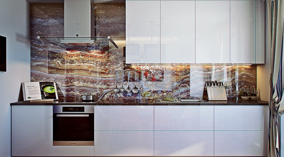 В декоре каждого помещения используются ткани синего цвета, а в отделке стен — имитация натуральных материалов. Так, минуя белые глянцевые фасады кухни, взгляд фокусируется на стеклянном фартуке с фотоизображением текстуры оникса. Поскольку в кухне всегда не хватает мест для хранения, то дизайнеры создали симметричную композицию из шкафов белого цвета. Стеклянные витрины, перекликающиеся с фартуком, смягчают резкий перепад между глубокими шкафами и поверхностью стены.