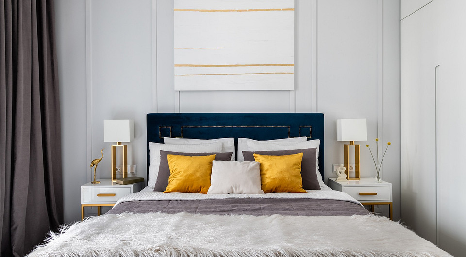 В спальне цвет стен нейтральный — серый. Но он разбавлен насыщенным синим оттенком (кровать) и желтым металлом (люстра и настольные светильники).