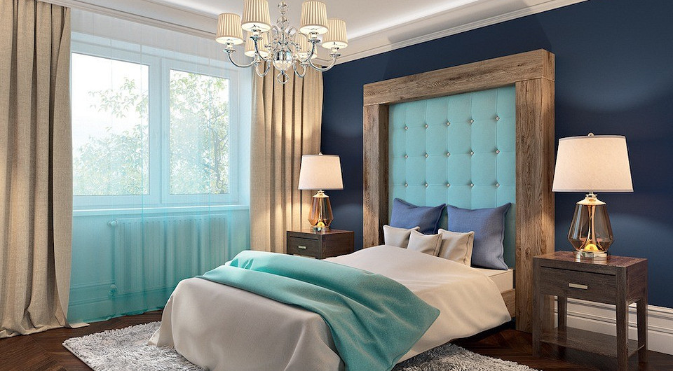 Две стены покрашены в «прусский голубой» — цвет, который ещё называют королевским. Его глубину и выразительность усиливают «медовые» основания ламп и рама зеркала. Золотая отделка и изящные светильники контрастируют с грубым изголовьем кровати из состаренного деревянного бруса. Натуральная древесина и классический дубовый паркет — «цитаты» из деревенского стиля, обращение к простым формам. Таким образом, в одном пространстве иронично сведены помпезность и простота. Брутальное изголовье и изысканный декор связывает нейтральный текстиль.