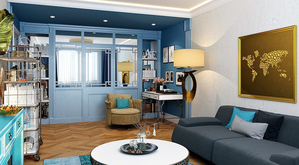 Зеркальный фасад гардеробной оформлен пилястрами с каннелюрами и фигурными раскладками, которые придают ей законченность и «историзм» (XIX — начало XX в.). Синий и его оттенки с акцентами цвета бронзы объединили эклектичную обстановку гостиной, в которой присутствуют элементы минимализма (диван и ковёр), этно (комод), лофта (сетчатая этажерка), а также дизайнерский журнальный стол-пружина.
