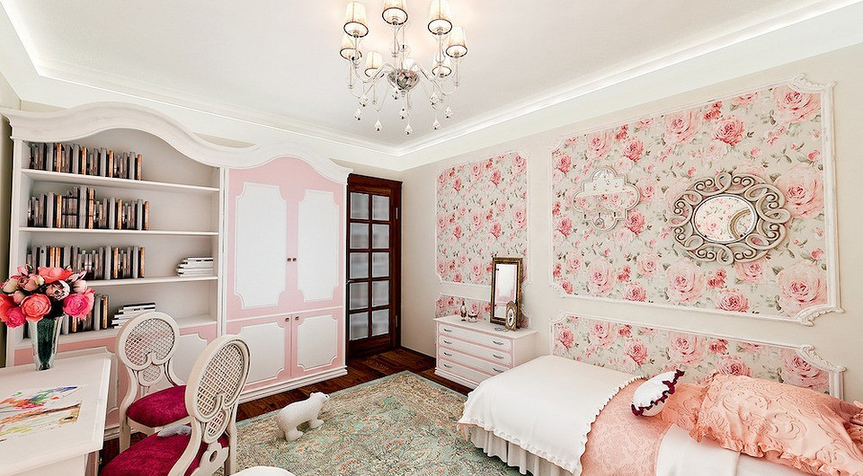 Оформляя комнату для двух девочек, дизайнер представляла себе комнату маленьких принцесс. Атмосфера доброй сказки создаётся с помощью доступных средств: цветовой гаммы пастельных тонов с преобладанием розового, цветочных принтов, оборок и мягких складок текстиля. Для того чтобы избежать однообразия, светлый фон разбавляется акцентами тёмно-бордового цвета (обивка стульев и стёганые изголовья кроватей). Досуговая зона смещена вглубь помещения, а спальная — к окну. Когда дети подрастут, расположение зон можно будет поменять местами.
