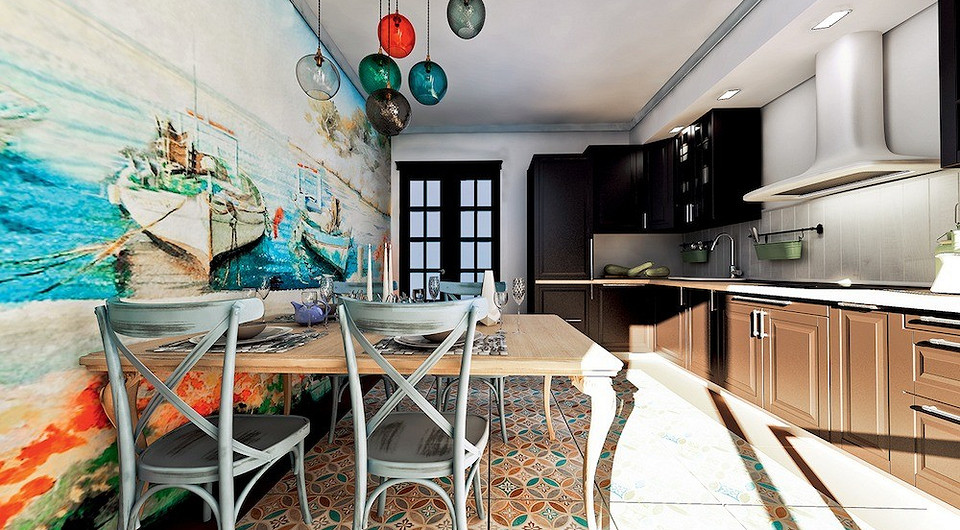 Помещение оформлено в тех же цветах, что и гостиная, тёмная деревянная мебель контрастирует с лёгким светлым фоном. Светильники в виде разноцветных шариков создают в кухне несколько легкомысленное, жизнерадостное настроение. Одна из стен украшена фреской с морским пейзажем, которая «раздвигает горизонты» городского жилища, — кухня напоминает летнюю веранду средиземноморской виллы. Причём обеденный стол совсем необязательно придвигать вплотную к стене, чтобы не закрывать живописное полотно.