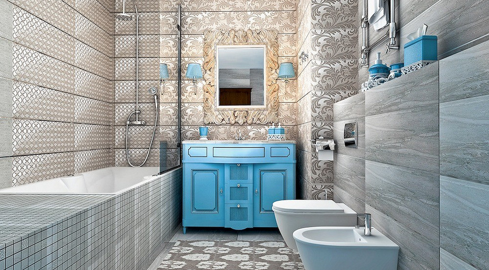 Интерьер ванной решили оформить в нейтральных бежевых тонах. Для облицовки поверхностей использовали плитку, рисунок которой имеет 3D-эффект.