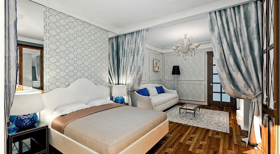 Цветовая гамма гостиной сохраняется и в спальне, что визуально объединяет обе части комнаты. Акценты, связывающие их воедино, — синие детали, которые напоминают драгоценные топазы в серебре.