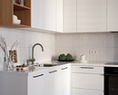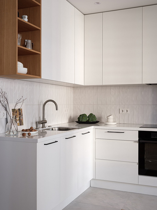 На кухне организовали мини-гостиную зону, площадь это позволяла. Сам кухонный гарнитур сделали угловым, с верхними шкафами до потолка и секцией открытых полок. В дизайне гарнитура поддержали ту же концепцию с акцентами из дерева: колонна со встроенным холодильником и открытые полки выполнены под цвет деревянного пола.