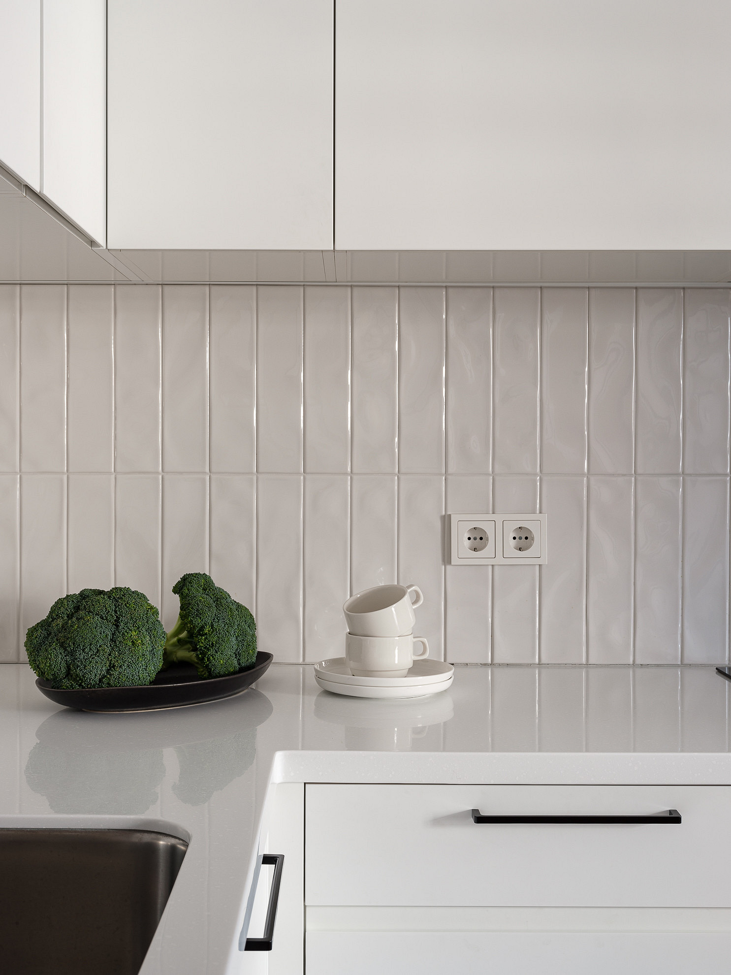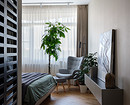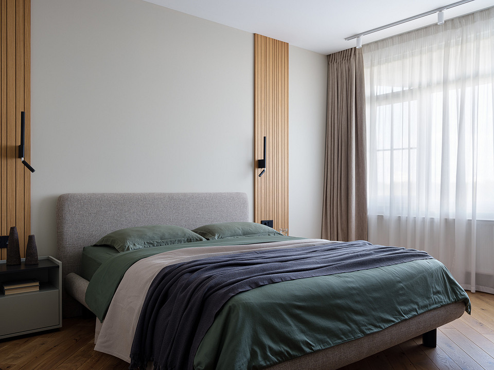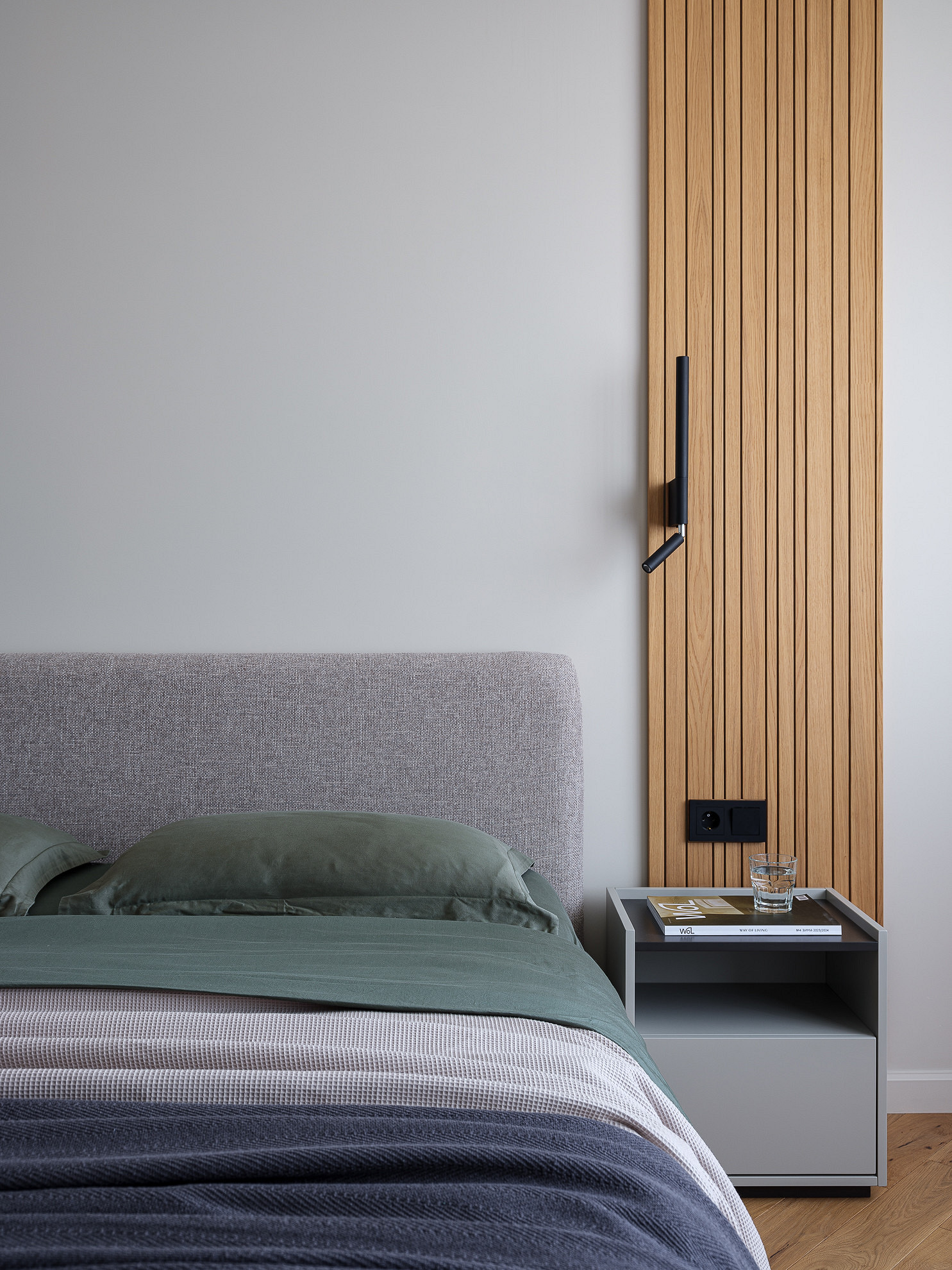 «Основная цветовая палитра нейтральная: мягкие бежевые и серые оттенки, которые создают ощущение легкости. Чтобы избежать стерильности, я добавила цветовые акценты в черных тонах, текстуры натурального дерева и обилие зеленых растений. В спальне и кабинете на стенах — вертикальные деревянные панели. Они вносят тепло и ритм, формируют гармоничный фон», — комментирует Анна.