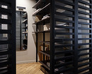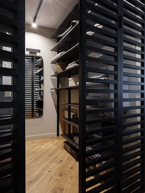 В спальне — гардеробная с полками, рейлами для одежды на плечиках и выдвижными ящиками. От комнаты гардеробная отделяется реечной перегородкой с дверью.