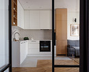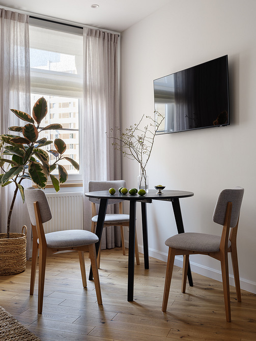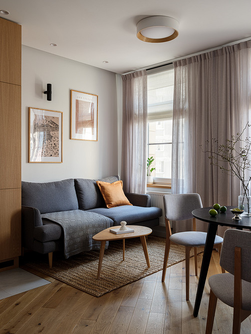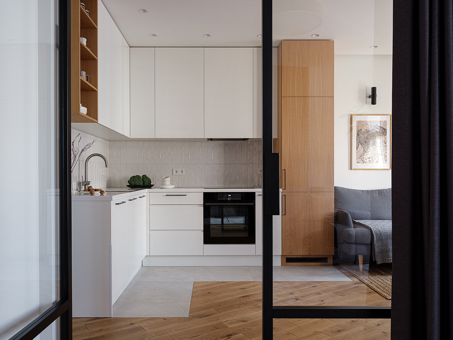 Дизайнер работала в концепции скандинавского минимализма: нейтральные цвета, акцент на натуральных материалах и фактурах. Для стен выбрали светлую краску. Акцентировали стены по бокам от кровати в спальне и за диваном в гостиной-кабинете с помощью деревянных панелей. На пол уложили инженерную доску, подобрав цвет под панели. Кухонный гарнитур выделили рядом напольной плитки светлого серого цвета.