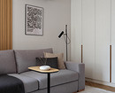 Гостиная-кабинет в будущем может стать детской комнатой. Поэтому там предусмотрели встроенный шкаф для одежды, а также книжный шкаф-витрину. Цвет витрины сочетается с деревом на полу и панелями на стене.