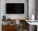 У окна расположен рабочий стол, а в нише, которая образовалась из-за наличия несущих колонн, организовали телевизонную зону с местом для хранения книг и разных мелочей.