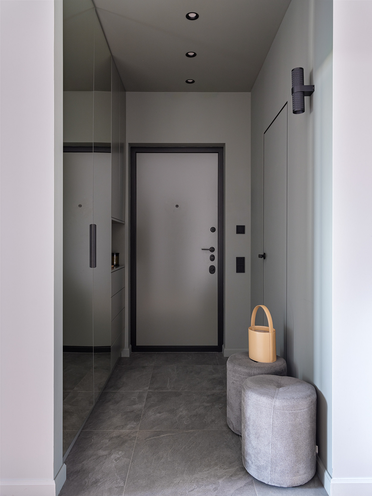 Автор проекта продумала системы хранения не только с учетом имеющихся вещей у молодой семьи, но и с заделом на будущее. Так, в прихожей встроен неглубокий шкаф с зеркальными фасадами, а у входа — система хранения с открытой полкой, заменяющей консоль, и ящиками для обуви.