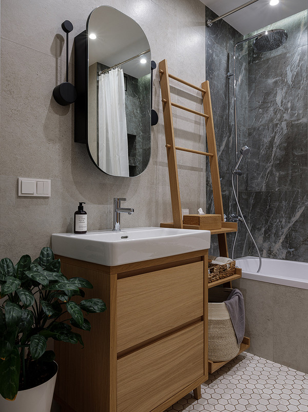 В санузле же стены решили покрасить. На полу — тоже мозаика, но уже черного цвета. И все эти фактуры сочетаются со светлым деревом.