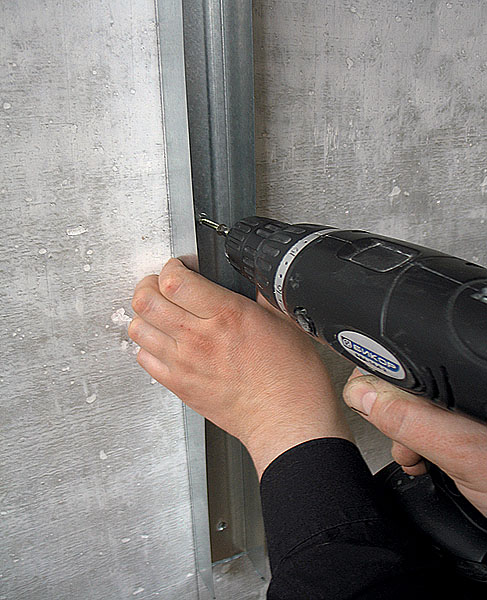 Монтаж барной стойки: нарезали фрагменты профилей необходимой длины (а). Просверлили в них отверстия под крепеж (б). При помощи дюбелей с шурупами привинтили направ-ляющие профили к стенам (в). Из жестких («стеновых») профилей собрали каркас (г). Обшили его ГВЛВ и укрепили стыки перфорированным уголком, затем зашпаклевали и окрасили конструкцию (д)
