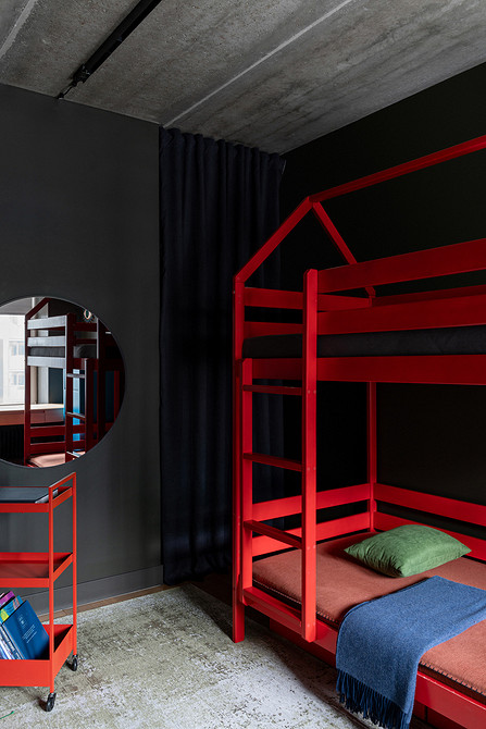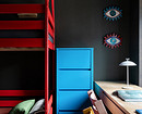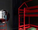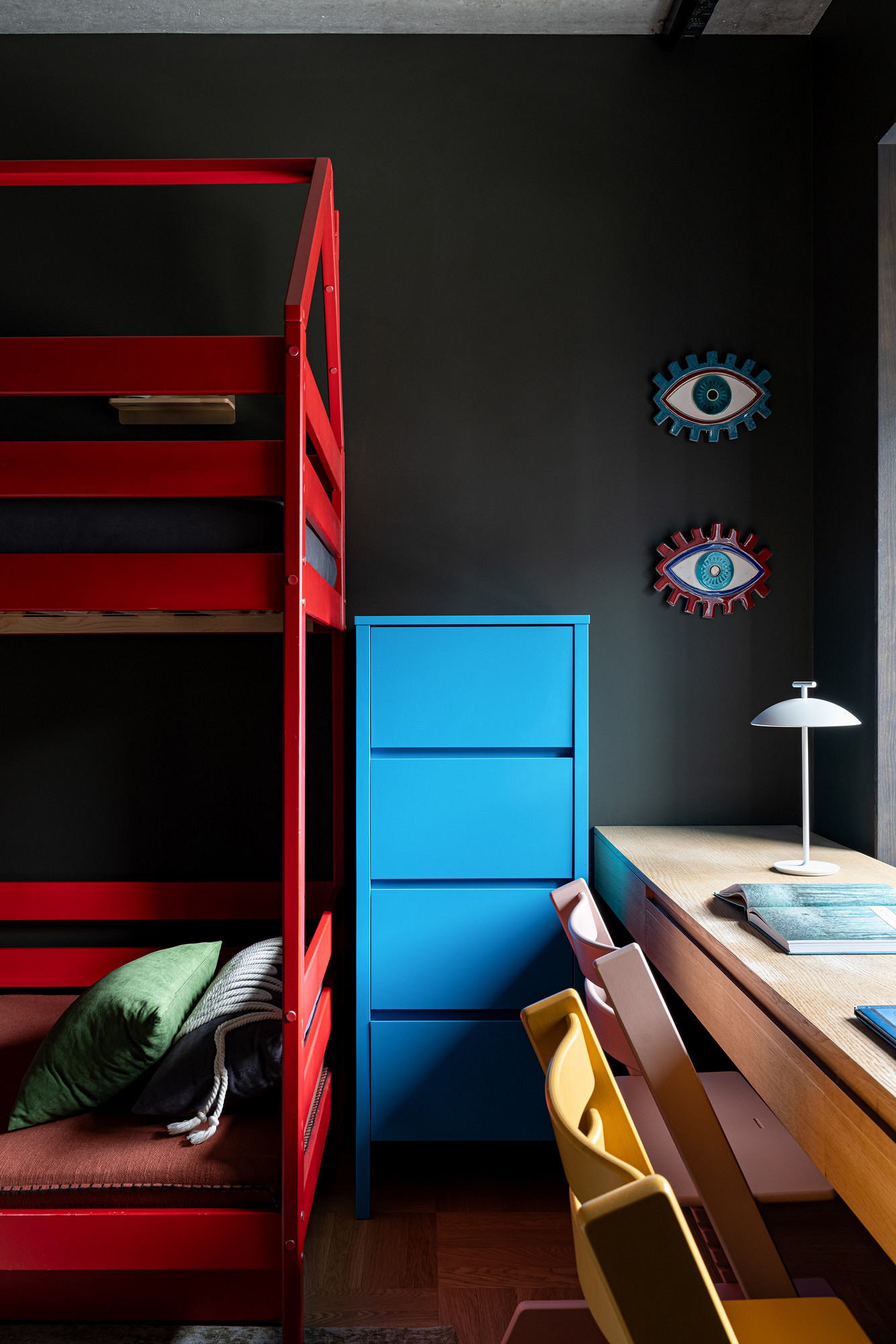 В детской комнате мало мебели, но за счет ярких цветов обстановка воспринимается достаточной, оставляя пространство для подвижных игр. Если убрать спальные принадлежности в комод, то двухъярусная кровать превращается в спортивный комплекс. Стулья с регулируемыми по высоте сиденьями рассчитаны на вырост.