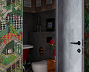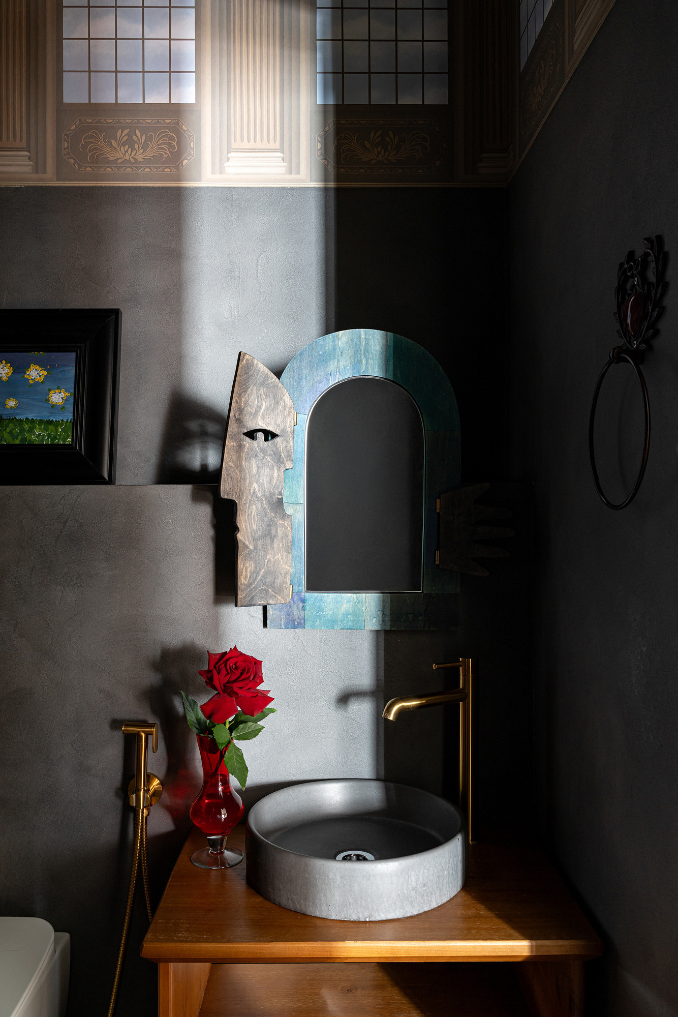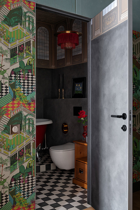 Иллюзию света и простора в ванную комнату дочерей вносит отделка верха стен влагостойкими обоями с изображениями арочных окон. Основные поверхности стен отделаны декоративной штукатуркой для влажных помещений с эффектом бетона. Арочное зеркальце над раковиной привезено из Праги.