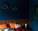 Насыщенный синий фон родительской спальни выгодно дополняет изголовье кровати в отделке натуральным шпоном дерева, ярко-оранжевый и пестрый текстиль. Глазки над кроватью — обереги от сглаза. Согласно поверьям, особо распространенным в Татарстане, изображение глаза притягивает и нейтрализует негативную энергию.