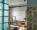 Друзья часто заходят в гости, поэтому для посиделок предусмотрена большая столовая зона. На этапе перепланировки отдельную кухню и примыкающую к ней комнату объединили в общее пространство. Из функциональной кухни дизайнер сделала «картинку»: вместо привычного верхнего яруса шкафов и полок идет выразительный геометрический орнамент, выложенный из керамической плитки. Встроенному холодильнику нашлось место по соседству, в утепленной лоджии. Прихожая модернизирована естественным освещением за счет широкого открытого проема, ведущего в гостиную, и строительства новой перегородки из стеклоблоков.