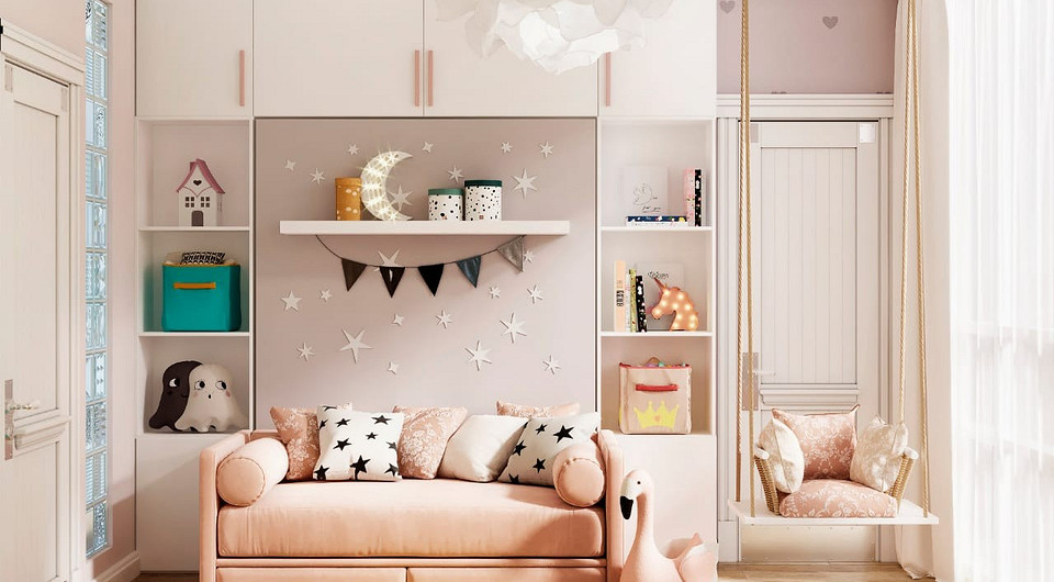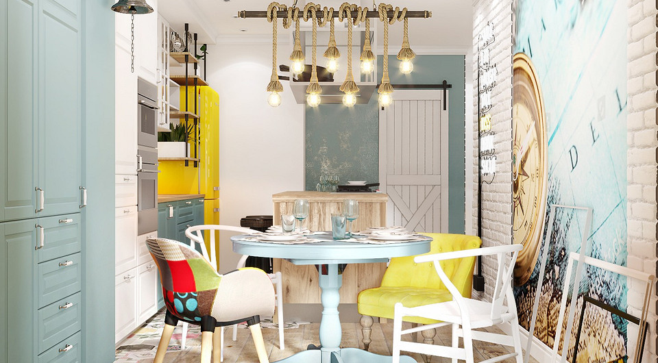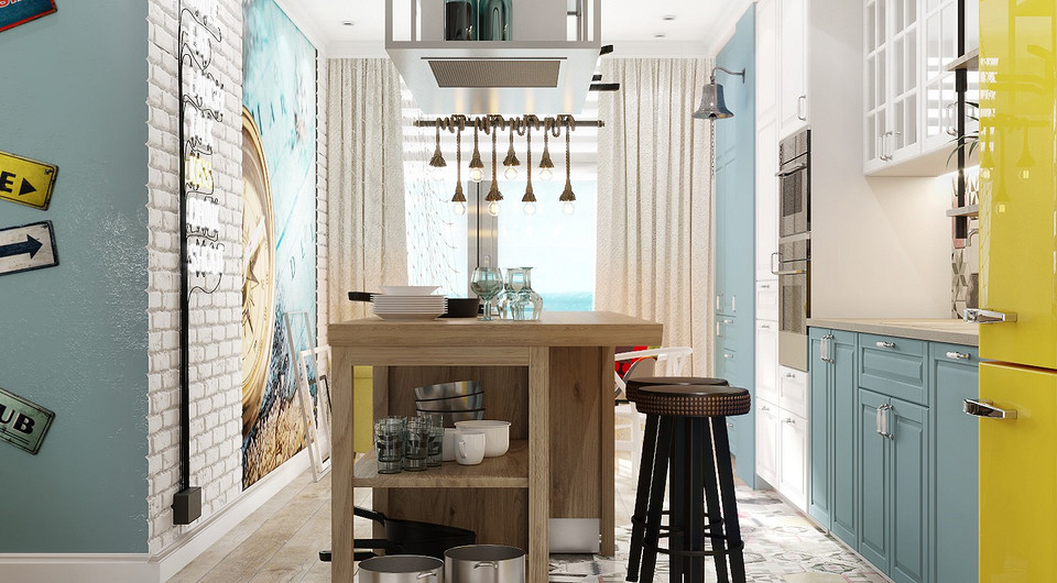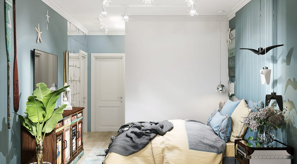 Интерьер будет оформлен в морской гамме: преобладающий оттенок — бирюза, в детской зоне также добавлены мягкие оттенки бежевого и лилового. Присутствуют и желтые акценты.