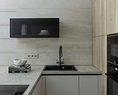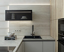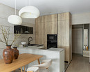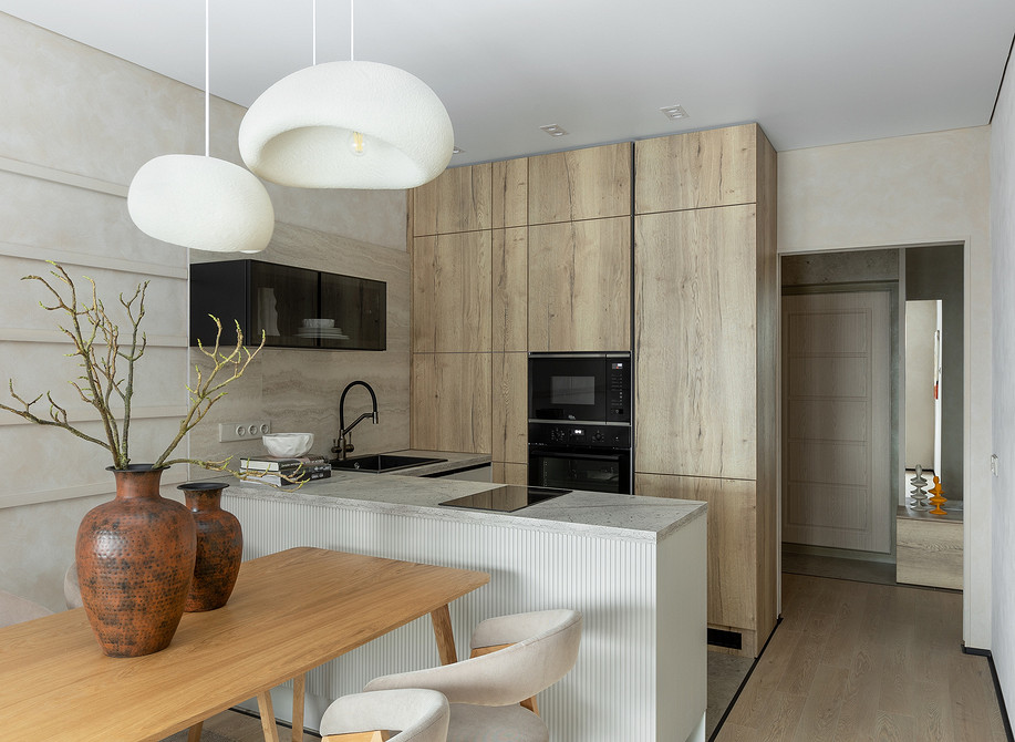 Кухня достаточно компактная, но вместительная за счет П-образной конструкции. От верхних шкафов отказались в пользу высоких колонн с техникой и хранением. Подвесили только небольшой шкафчик-витрину для посуды и акцентировали внимание на фартуке из керамогранита под камень с подсветкой. Деревянный стол приставлен к кухне и выступает акцентом за счет своей активной фактуры.