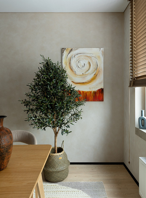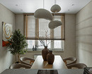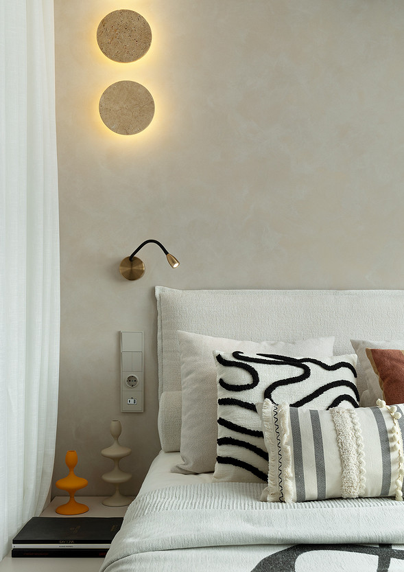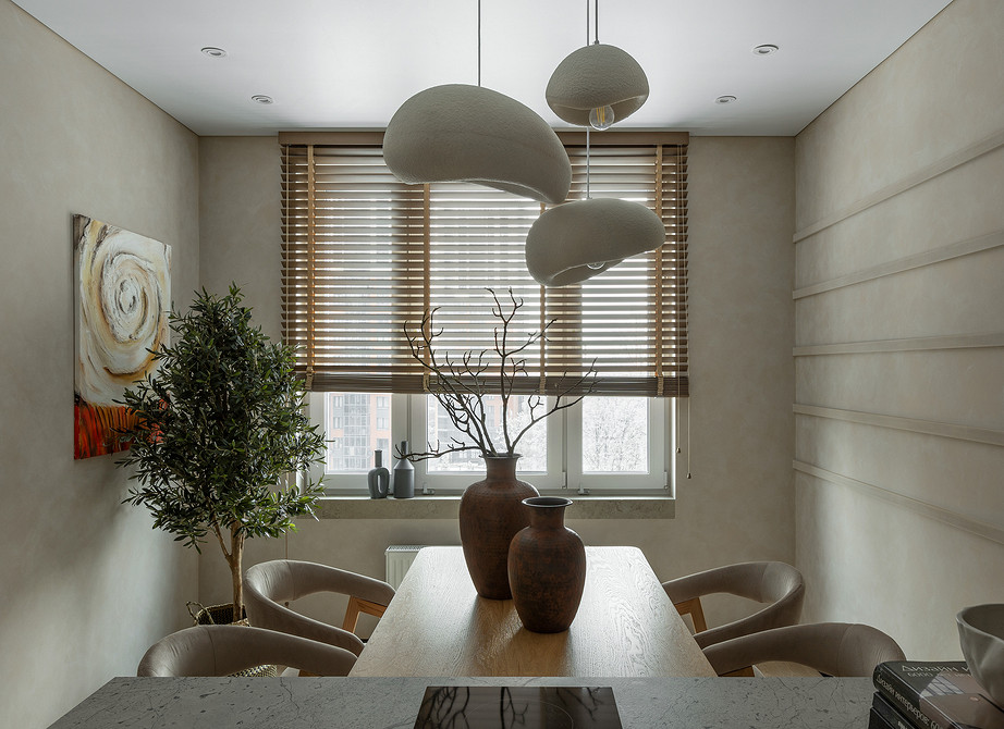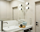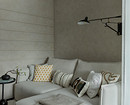 Общее освещение — точечные, встроенные в потолок светильники. Но акцент дизайнер сделала на дополнительных сценариях. Это скульптурные подвесы над столом на кухне, скрытые подсветки, которые формируют атмосферный свет (фартука кухни, потолка и зеркала в ванной комнате), бра у кровати, дивана и зеркала в ванной комнате, а также пара направленных спотов над зеркалом в прихожей. «Мы добавивались ощущения, как будто свет проникает через листву деревьев где нибудь в лесу, или через скальные щели в горах», — делится Аида задумкой по свету в прихожей.