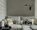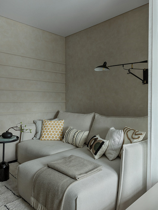 Для отделки стен выбрали декоративную краску с фактурным эффектом штукатурки. В зоне гостиной и на кухне использовали молдинги, покрашенные в цвет стен — это добавило пространству динамики. На пол уложили ламинат под светлое дерево, а зону кухни и прихожей выделили керамогранитом с рисунком терраццо. Причем в прихожей керамогранитом оформили и стену над входной дверью, и откосы — для практичности и визуальной цельности.