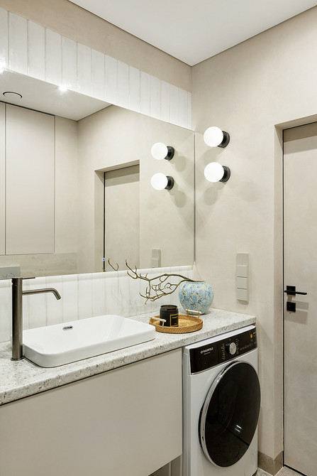 В ванной комнате — тумба под раковину рядом со стиральной машиной и шкафчик над инсталляцией унитаза.