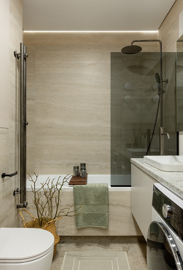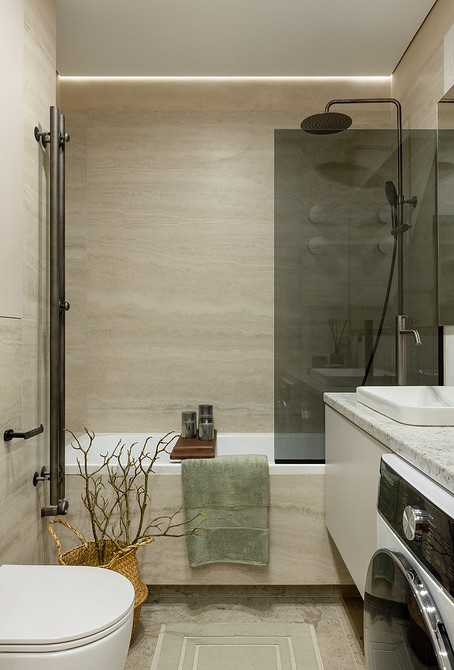 В ванной комнате использовали керамогранит с рисунком натурального камня на стенах, похожий подобрали для пола, но фактура немного отличается. В зоне раковины решили использовать мелкоформатную прямоугольную плитку, чтобы разнообразить интерьер и не превратить ванную в каменную «пещеру».