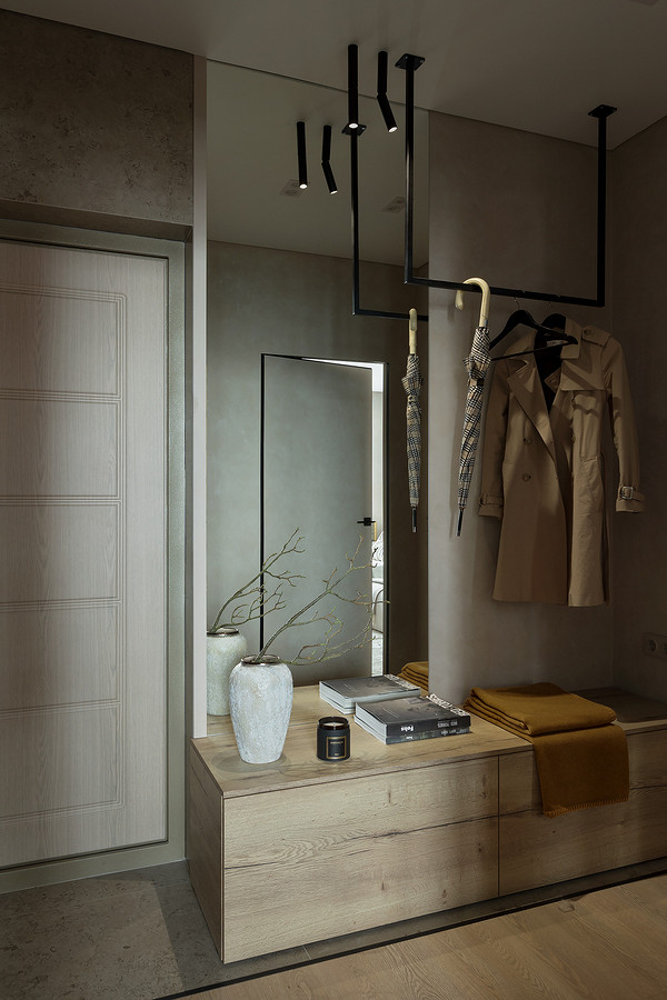 Так как в прихожей выделили отдельную гардеробную, куда поместилась сезонная одежда, спортивное снаряжение, такое как сноуборд, и прочие вещи, при входе решили сделать облегченную конструкцию. На потолке закреплена вешалка для повседневной верхней одежды, а также монтирована напольная тумба с местом под обувь.