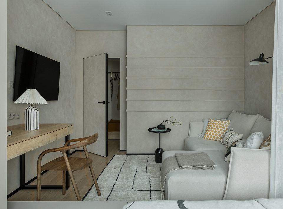 Владелец квартиры — молодой мужчина, работающий в сфере IT удаленно. Свою сестру, дизайнера Аиду Прокофьеву, он попросил создать пространство, удобное для жизни и работы. «Необходимо было зонировать комнату и отделить рабочую зону от зоны для сна. Также нужно было учитывать, что основное время он будет проводить дома, и пространство должно было быть спокойным и не отвлекающим от работы», — комментирует автор проекта.