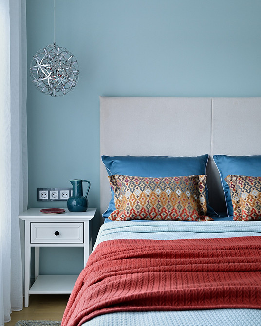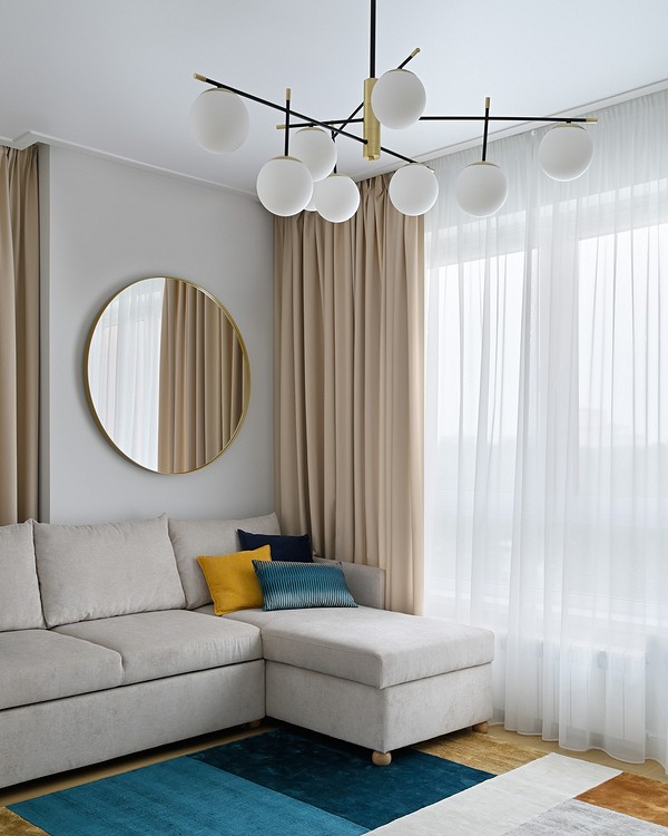 Владелица хотела получить светлую, комфортную, функциональную квартиру. Лаконичную, без лишних деталей, оформленную в пастельных тонах. Но концепцию доработали, когда заказчица прислала дизайнерам цветовую палитру, которая ей понравилась: там сочетались оттенки синего, горчичного и бежевого.