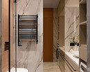 В ванной комнате использовали керамогранит под мрамор с коричневыми прожилками. Часть стены оформили тонированным зеркалом, чтобы также визуально увеличить пространство. Зона унитаза выделена терракотовой мелкоформатной плиткой, ей вторит цвет двери.