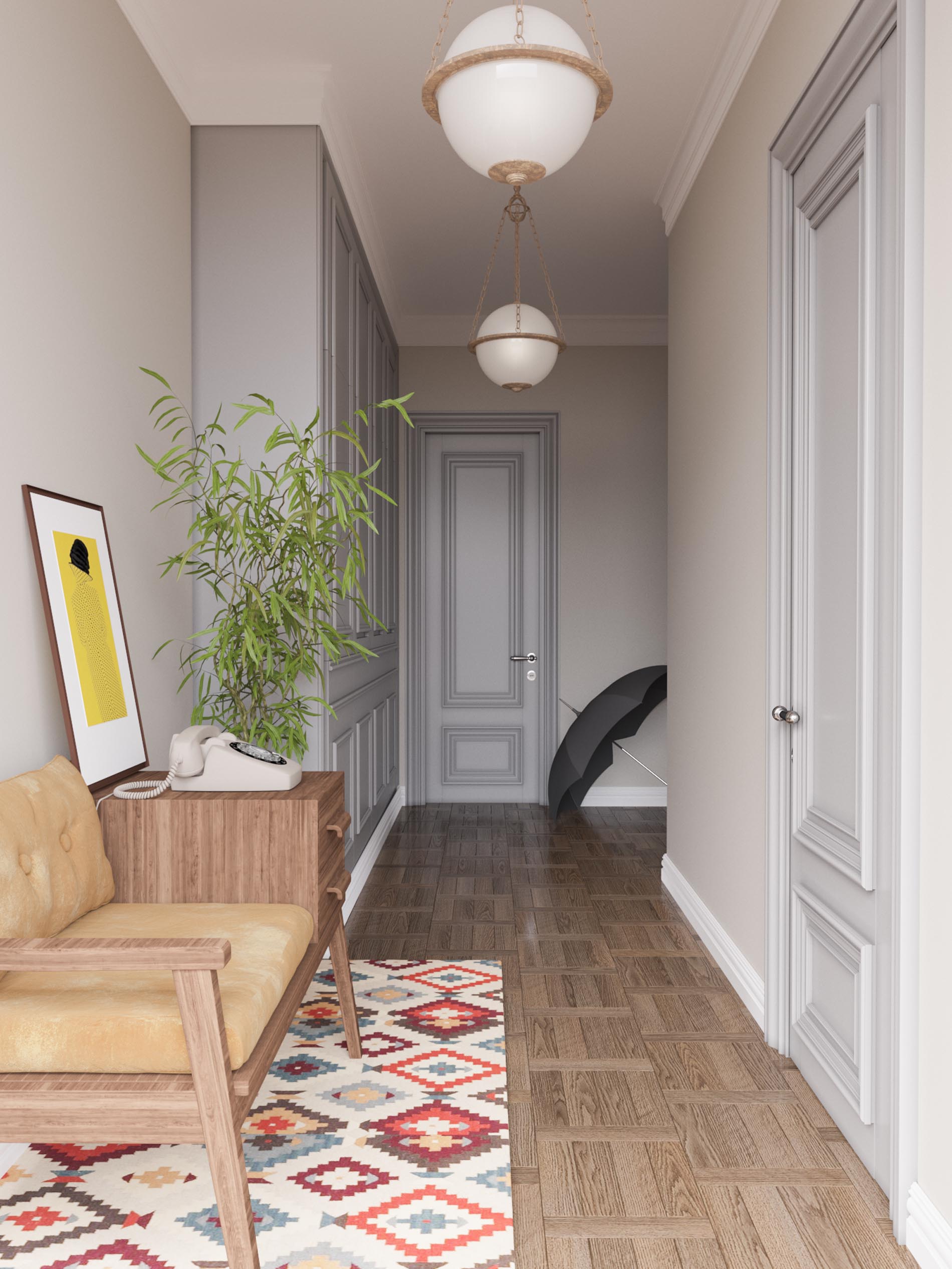 Авторы представили, что владельцами трёхкомнатной квартиры могут быть две семьи: родители и уже взрослый сын с женой. Оба поколения объединяют общие интересы, эстетический взгляд и традиционные ценности. Предложенный авторами стиль представляет собой микс из разных направлений: скандинавского, винтажного, элементов из 60-х гг. прошлого столетия и предметов советского времени. Декор — собственность владельцев, это проигрыватель виниловых пластинок, книги, вазы и статуэтки, которые были всегда частью их жизни. Все стены покрасят в нейтральные оттенки, от светло-серого до тёмносерого, в гостиной используют обои с фотопечатью в винтажном духе1970-х гг. В спальне применены более глубокие, расслабляющие и деликатные оттенки. Гостиную расположат в самой маленькой комнате, из которой будет вход в комнату родителей, это сделает общественную зону проходным помещением (намёк на планировку квартир в сталинских домах). Новый проём шириной 90 см в несущей стене гостиной требует усиления металлоконструкцией. За счёт переноса межкомнатной перегородки между прихожей и гостиной площадь комнаты удастся увеличить. Туалет и ванную комнату объединят в одно помещение. Выбор материалов обусловлен стилизацией под поздние советские годы: классическая раскладка паркета ёлочкой, покраска стен, высокие фигурные карнизы и плинтусы.