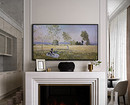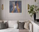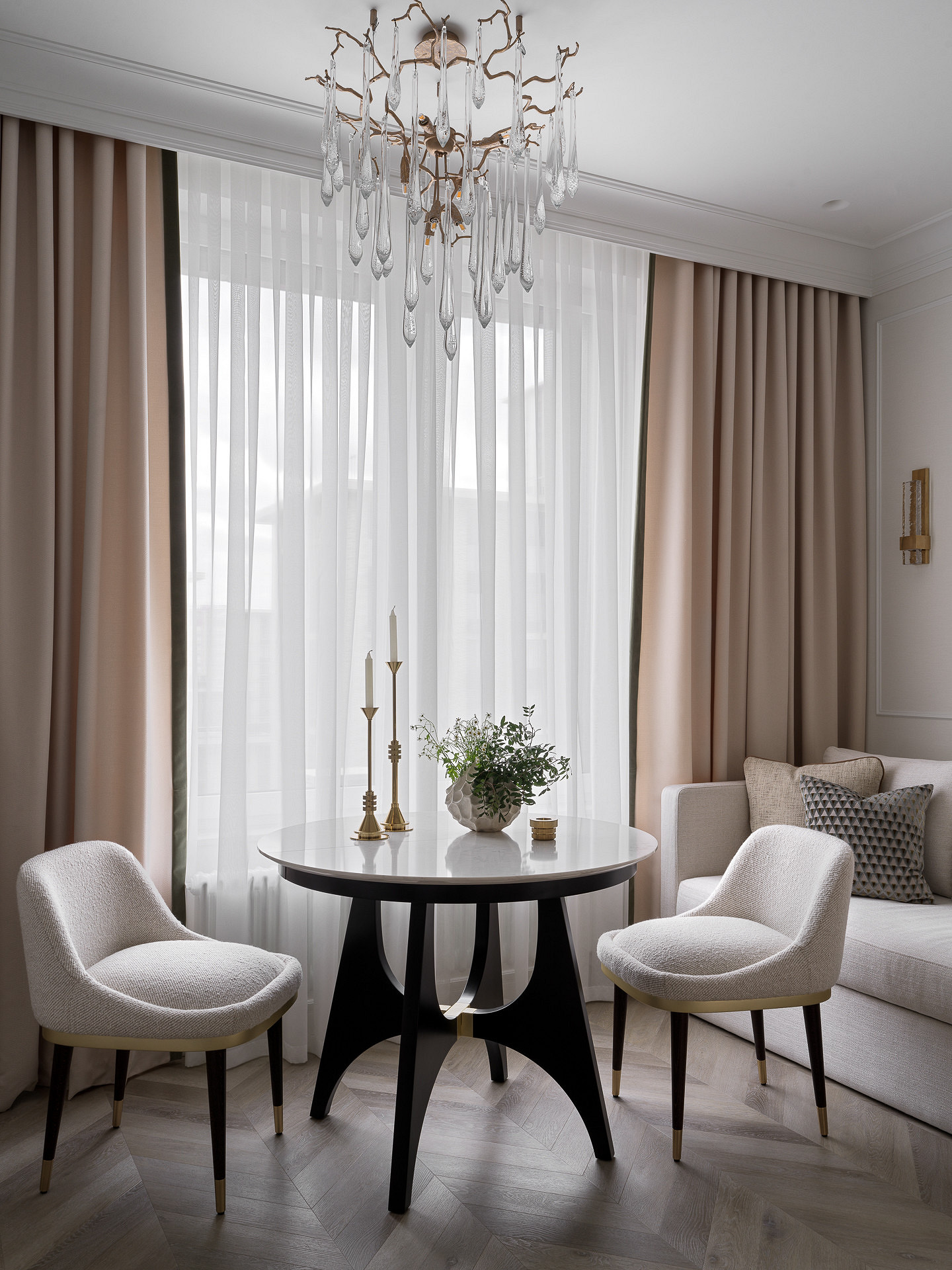 В гостиной зоне расположили раскладной стол на 8 человек (хозяева просили предусмотреть место для приема гостей), раскладной диван. Напротив дивана — паровой камин. Это мечта хозяйки квартиры, которая исполнилась. «Пар улучшает качество воздуха в помещении, особенно в зимний период. Это положительно влияет на здоровье и комфорт. В верхней части камина мы выполнили скрытый люк из мрамора, а в теле камина расположили блок управления ТВ. Телевизор мы подобрали определенной модели еще на стадии проектирования, без массивных кронштейнов на тонкой раме. Установив картину любимого художника на заставку экрана, мы уже получаем не телевизор, а картину над камином», — отмечает Любовь.