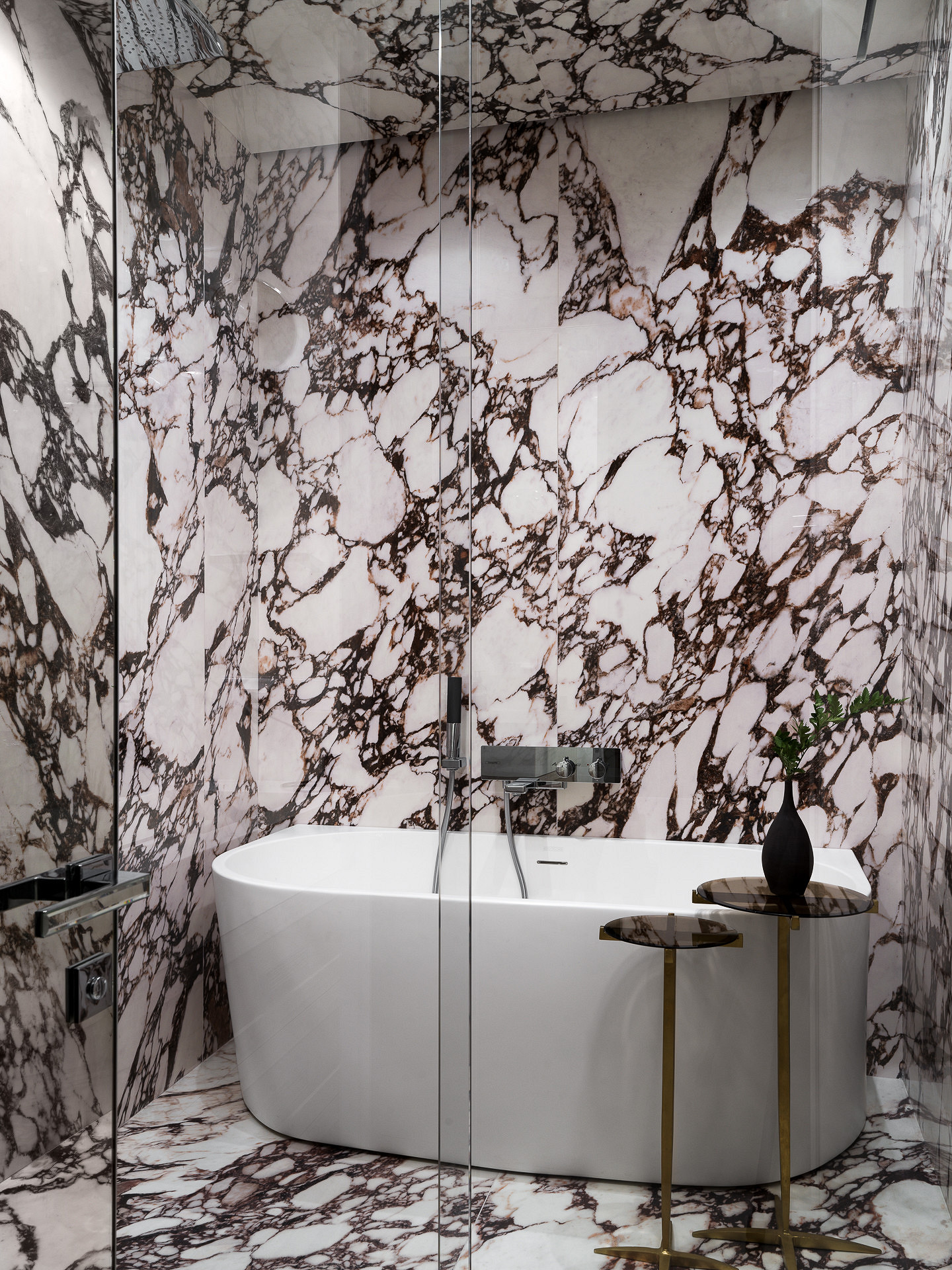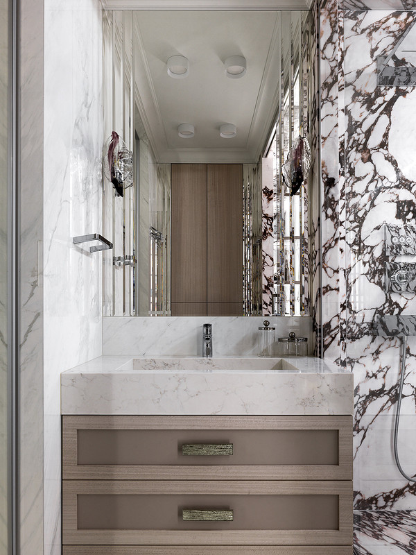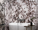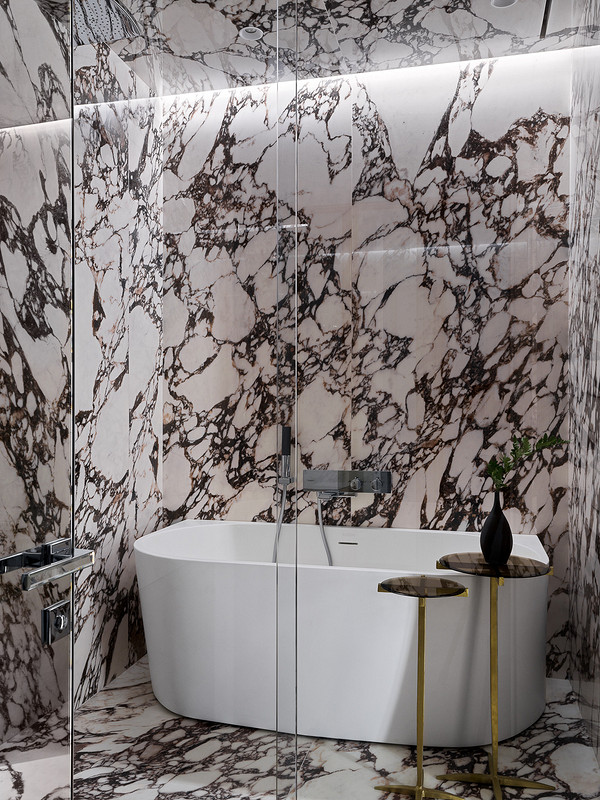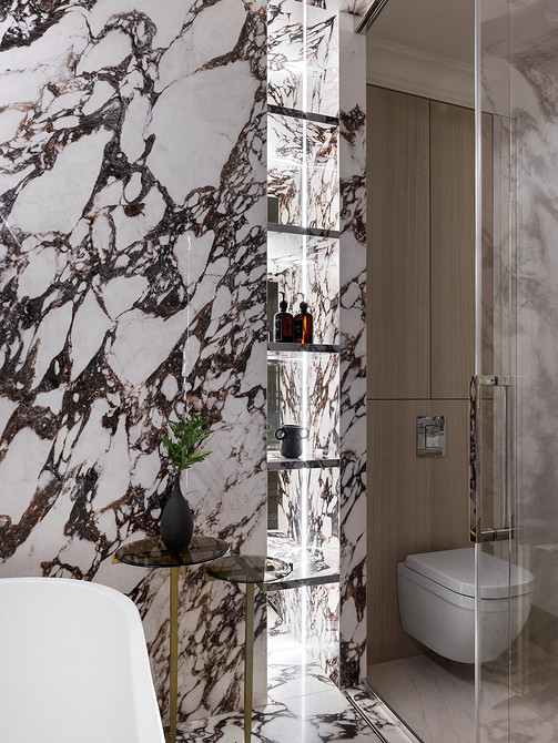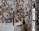 Ванная комната условно поделена на две части: при входе туалет и раковина, стены и пол в этой зоне отделаны керамогранитом под мрамор со светло-серыми прожилками; вторая часть — душевая и отдельно стоящая ванна на подиуме, где стены, пол и даже потолок оформлены керамогранитом с темно-коричневыми прожилками. На стенах — глянцевый керамогранит, а на полу — матовый, так как мокрый глянцевый керамогранит более скользкий.